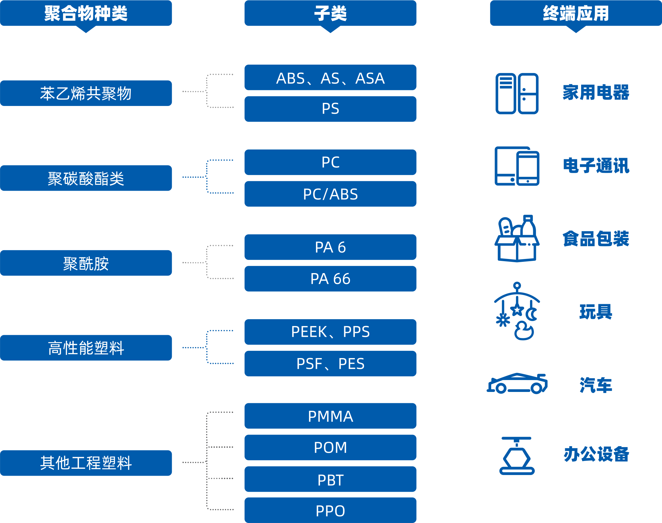 主营产品:ABS、PS、PC、PA、PEEK、PPS等塑料原料,应用于家电、电子电器、汽车、办公设备等领域,与国内外众多大型生产商建立了长期的战略合作关系。